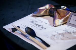 メニュー表一体型のランチョンマットに、リボン型にあしらわれたカラーナフキンが可愛らしいアクセントです。