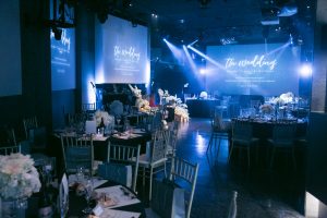 おふたりの披露宴は、海モチーフのライティングに白い装花が映える空間で。