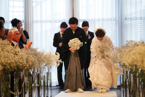 純白の白無垢と紋服をお召しになってご入場されるご新郎ご新婦様。