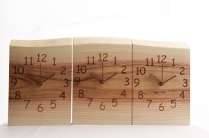 この時計、実は同じ木の幹を3つに切り分けてそれぞれを時計に仕立てたもの。