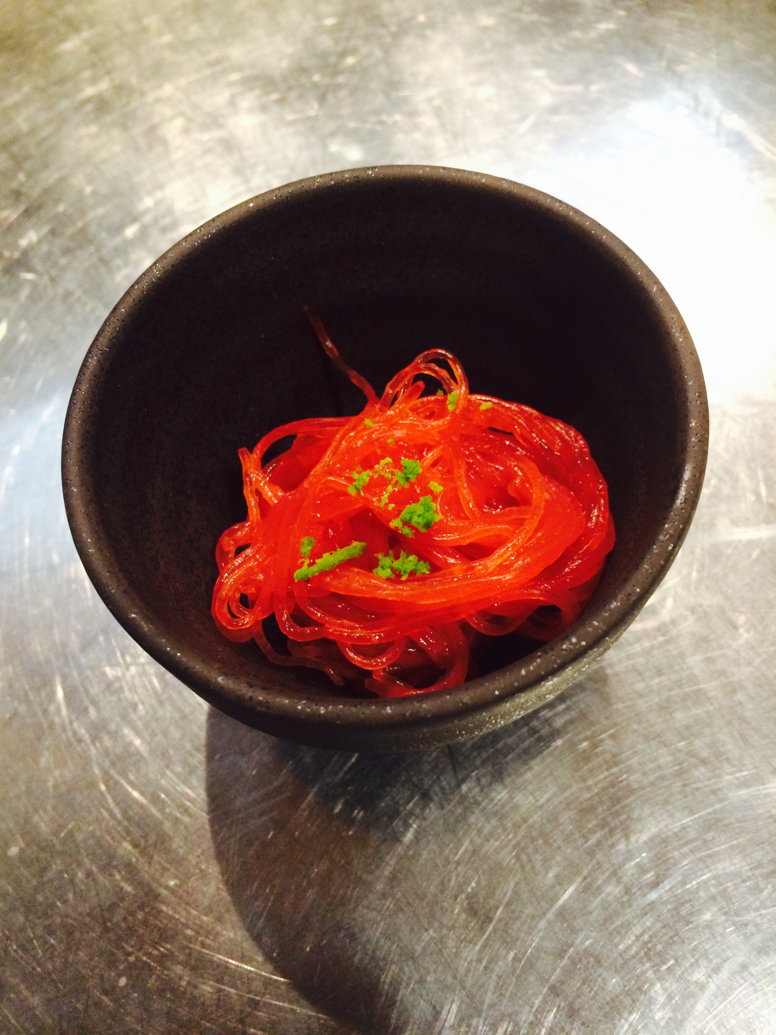 苺の春雨とホワイトチョコスープのなんとも不思議なデザートでした。