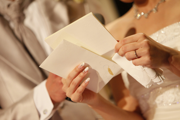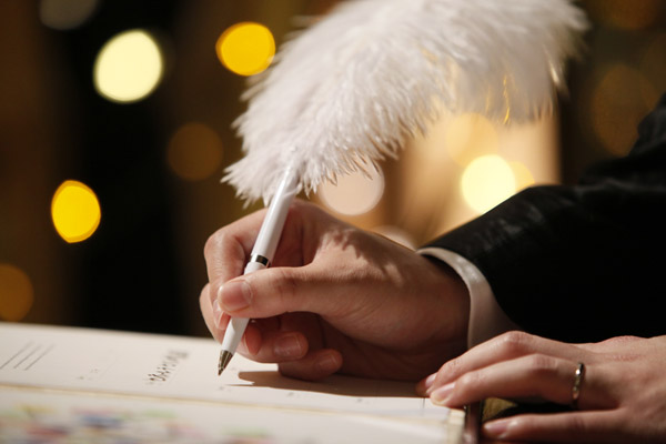 新婦さまに渡すブーケを持った新郎さまの手元、結婚証明書へのサイン中の手元、ご両親への手紙を読んでいる新婦さまの手元。