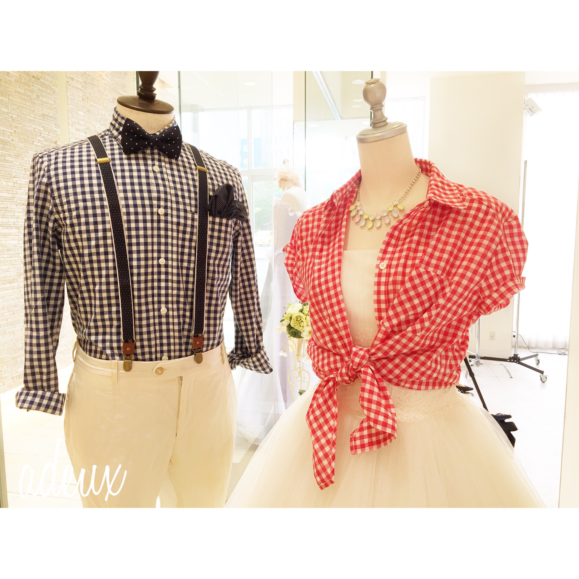 #リンクコーデ ♡ 2015.10.15 こんにちは! ドレスショップadeuxです☺︎ 最近リンクコーデ大人気です♡ #チェックシャツ かわいいーーー♡♡ ご新郎ご新婦さまオソロイです☆ お二人は二次会で合わせていましたっ! 登場した瞬間 『かわいいーーっ♥︎』の連続でした #デニム や #ドットアイテム #Tシャツスタイル #CAP などなど リンクコーデにおすすめはたくさんあるので ぜひstaffにもご相談くださいね♥︎ Prev Blog Top Next