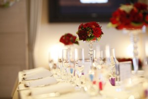 高砂のお花もゲスト様の席のお花も真っ赤にコーディネート。