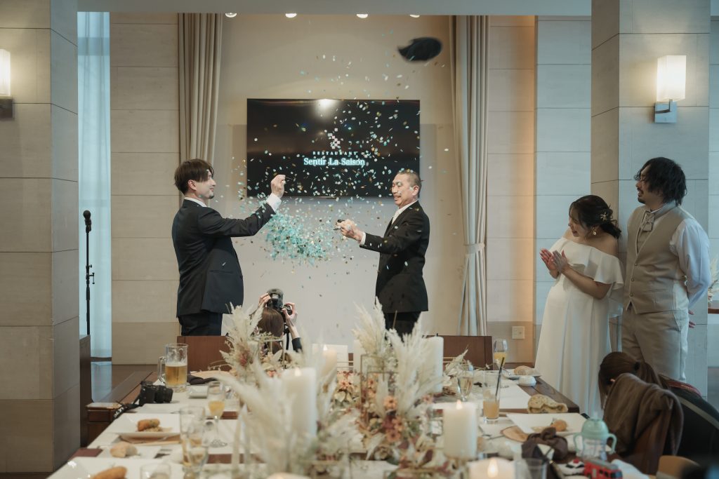 風船を割ると、、、、男の子でした~♪結婚式に、皆さんで新たなお祝いが出来るのも、とても素敵ですね♪