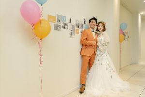 プロポーズの時に風船をお部屋いっぱいに装飾をして、サプライズプロポーズをしたんです、、、という想いをブライダルフェアで語って下さったお二人。